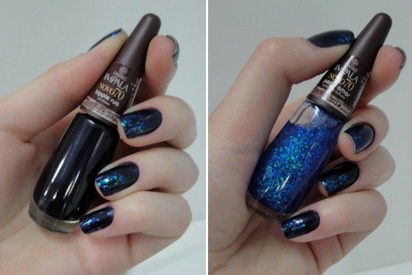 O legal é criar um contraste entre a cor do esmalte que vai ficar por baixo e a do esmalte com glitter. Outra sugestão é usar a mesma cor, mas em tons diferentes. Assim, o efeito fica parecendo um degradê com glitter. E foi o que nós fizemos!